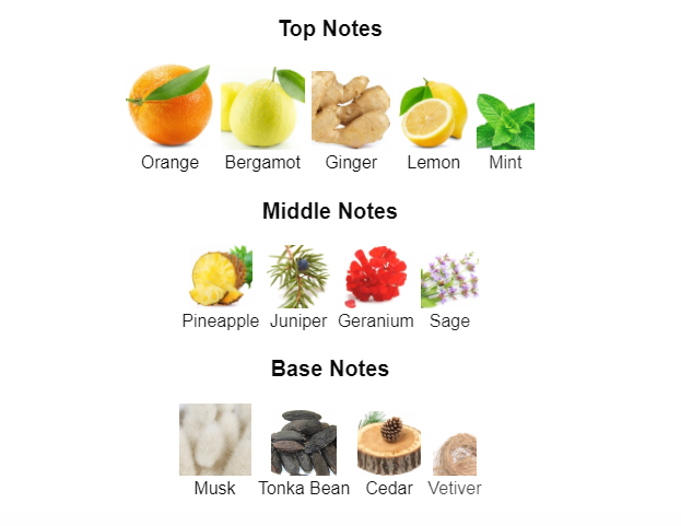 Top: Ginger, Bergamot, Orange, Lemon, Mint